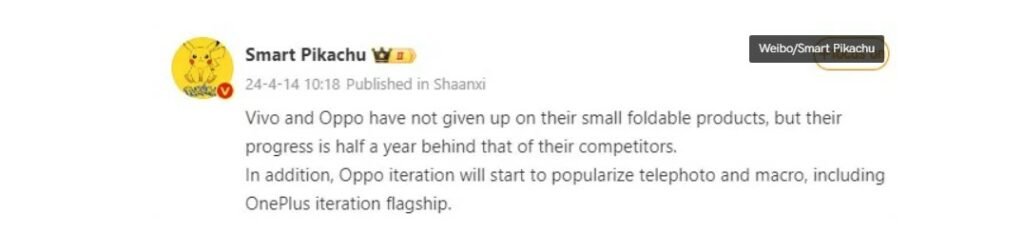 منبع آگاهی بهنام Smart Pikachu با انتشار پستی در شبکه اجتماعی ویبو چین میگوید گوشی تاشو فلیپ وان پلاس به حسگر دوربین تلهفوتو و همچنین دوربین ماکرو مجهز خواهد بود.