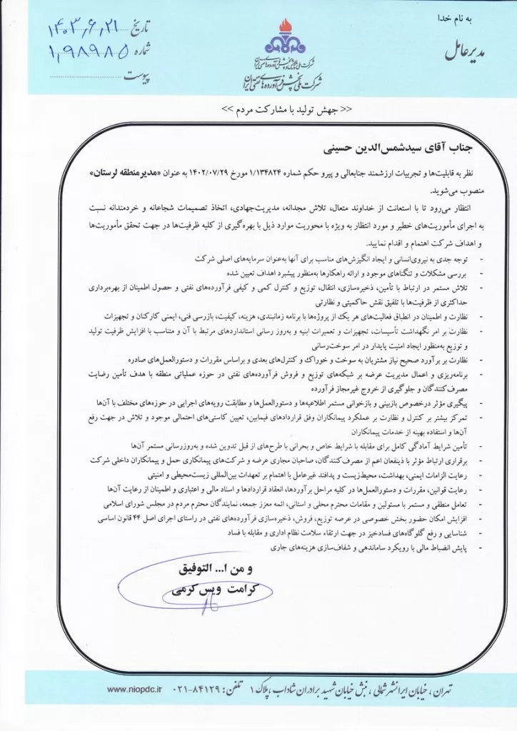 به گزارش انرژی پرس، مدیرعامل شرکت ملی پخش فرآوردههای نفتی ایران با صدور حکمی، سیدشمسالدین حسینی را بهعنوان مدیر پخش منطقه لرستان منصوب کرد.