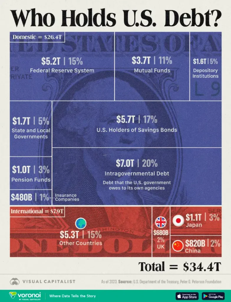 بدهی ناخالص ایالات متحده از ۳۴.۴ تریلیون دلار در پایان سال ۲۰۲۳ به ۳۶.۱ تریلیون دلار در دسامبر ۲۰۲۴ افزایش یافته است، و برخی کارشناسان آن را غیرپایدار میدانند. اینفوگرافی زیر، ترکیب بدهی ایالات متحده را بر اساس سهم سرمایهگذاران داخلی و خارجی و همچنین بخش های درون دولتی به تفصیل نشان می دهد.