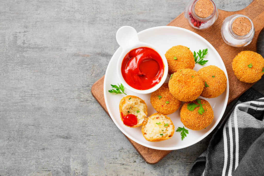 Arancini این کوفتههای سیسیلی سرخشده معمولاً از برنج و موزارلا و گاهی گوشت تشکیل شدهاند و با پودر سوخاری پوشانده میشوند.